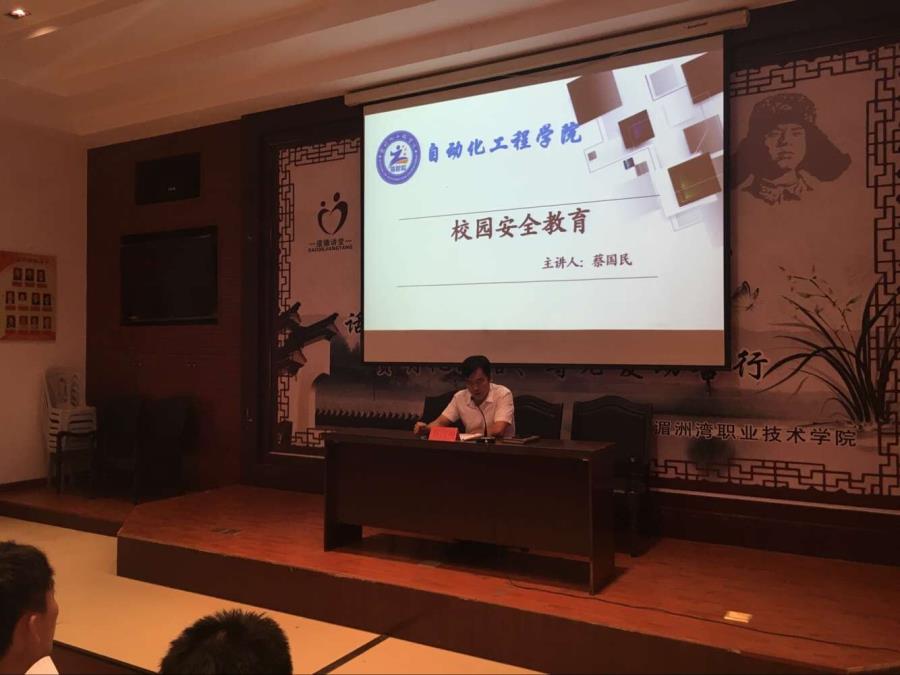 9月5日上午8:00,自动化工程学院“校园安全讲座”主题讲座于图书馆会议室成功举办。湄洲湾职业技术学院安保科科长蔡国民为我系生各班级班长做了一场内容丰富、生动详实的校园安全规范教育讲座。蔡科长从大学生的身边小事讲起,以大学生学习生活中的生动鲜明的案例,让同学们了解身边的安全隐患、注意事项、预防和处理方法。蔡科长从消防安全、防盗、防骗、个人安全等与大学生息息相关的内容入手,通过真实的事例叙述,归纳总结校园安全规范的要点。蔡科长的讲座,让同学们真切的感受到安全规范对我们大学生健康成长的重要意义,在此之前,从来没有想过安全隐患会出现在自己身边,也没有足够的重视,但是今天听了一个个鲜活的案例,让同学们警醒了,一定将今天学习的内容通过班会等形式向同学们传达,提高同学们的安全规范意识”。伴随着讲座的结束,2016年校园安全教育活动月圆满落幕。