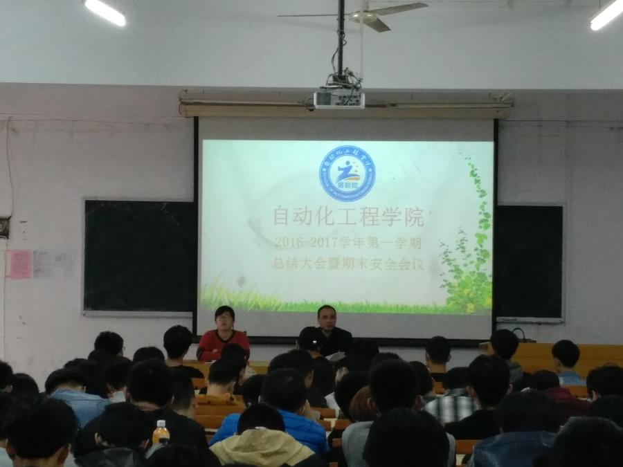 2016年12月27日下午3点30分,自动化工程学院于17号楼102召开了本学期总结大会暨期末安全会议。我系书记周奇峰老师、辅导员杨娴老师出席本次大会,同时,自动化系全体学生干部同学参加了大会。大会由书记周奇峰老师主持。
