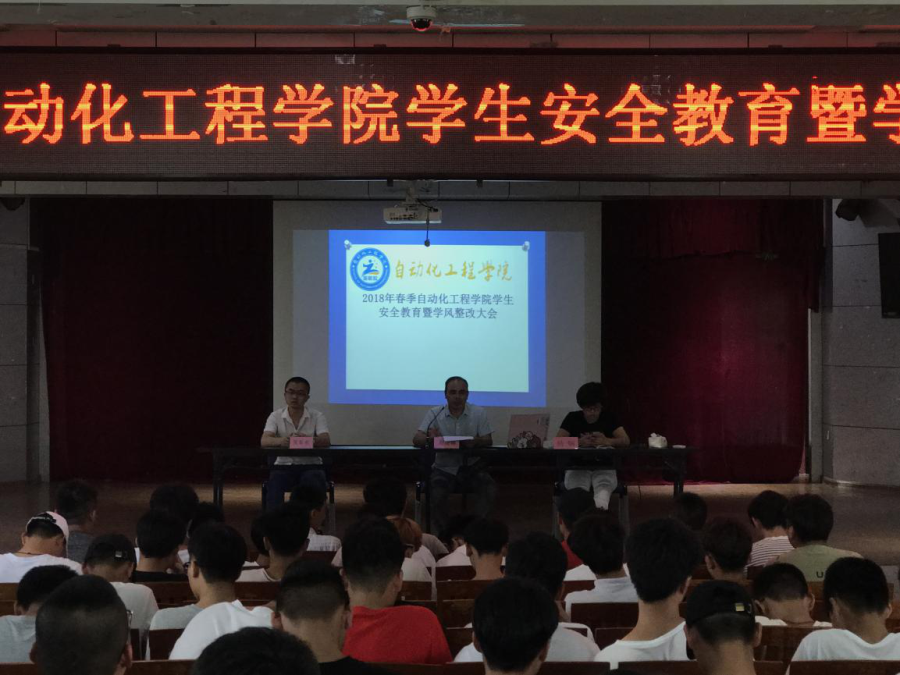 为了提高我系学生在校学习生活的安全意识,整改学生在校学习风气。2018年6月7日下午4点30分我系在17号楼201会议报告厅举行安全教育暨学风整改大会。参加本次大会的有自动化工程系党总支书记周奇峰,辅导员杨娴、吴东东及自动化工程系全体学生。