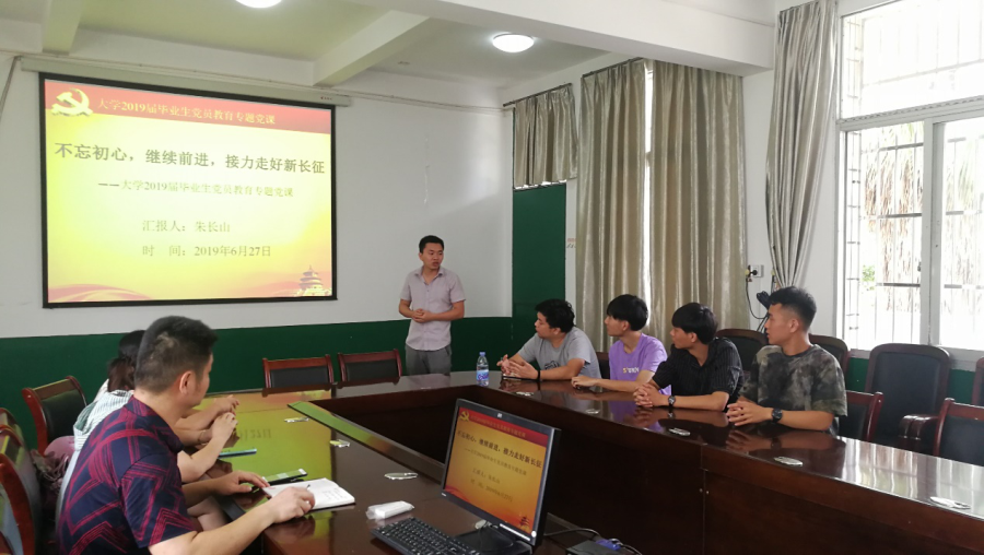 首先第一个会议是党课教育,主讲人朱长山老师他希望通过最后一次组织生活会、最后一次党课、最后一次重温入党誓词等系列活动,增强毕业生党员的身份意识,提高毕业生党员的党性修养。